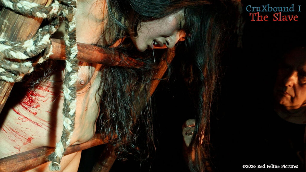 This second sequence of the CruXbound required an extensive and demanding filming schedule, stretching over two consecutive days. On each of these days, Ligia was compelled to climb the ladder, repeating the arduous ascent described previously. Once she had been secured to the ladder, Jac resumed his role, administering multiple lashes with the scourge.